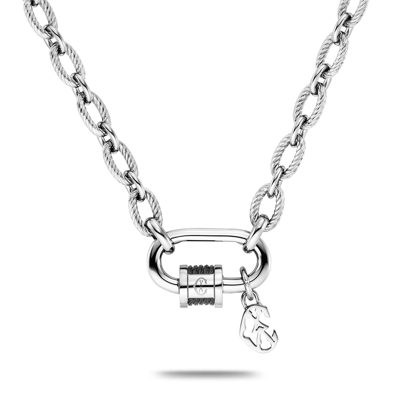 La collection propose trois modèles : un collier composé d'une chaîne en câble avec des boucles de câble torsadé alternées, disponible en différentes longueurs ; un bracelet à maillons assorti, fermé par un fermoir à mousqueton ; et un brin unique de câble torsadé avec des embouts contrastés. Proposée dans un mélange de métaux classiques, la ligne incarne un style audacieux et un charme utilitaire.
